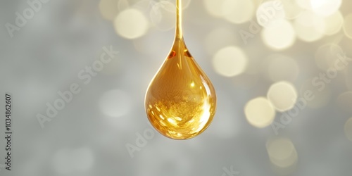 A golden oil droplet suspended in mid-air, reflecting light, and standing out against a dreamy silver bokeh background, symbolizing purity, health, and nourishment.