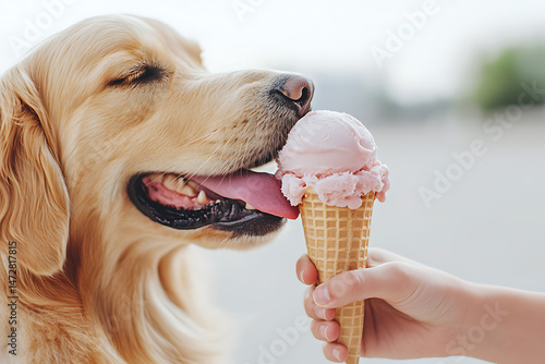A golden retriever enjoying a strawberry ice cream cone. The dog is seen licking the ice cream with its tongue out.