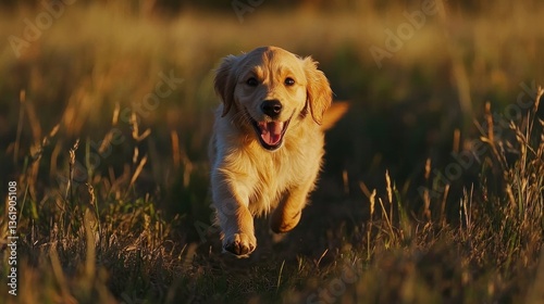 A golden retriever puppy joyfully runs through a tall grass field at sunset. The warm light illuminates the dog's fur, creating a vibrant image
