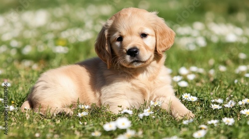 A golden retriever puppy playing in a field of daisies under the warm sunlight
