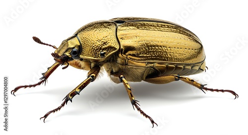 A golden scarab beetle with intricate patterns on its shell, shining against a white background