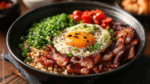A golden symphony of crispy bacon and fluffy fried eggs, a culinary masterpiece that awakens the senses with its savory aromas and satisfying crunch.