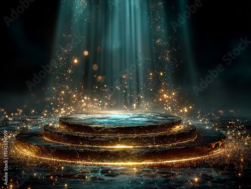 A golden three-tier podium illuminated by radiant golden spotlights from above, with sparkling particles and star-like glimmers