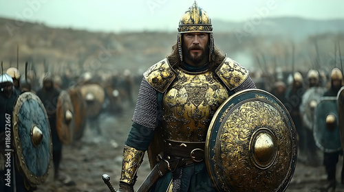 A Golden-Armored Warrior Leads His Army into Battle Across a Desolate Landscape