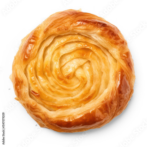 A golden-brown pastry with a flaky, golden-brown crust, filled with a creamy, white filling, on a transparent background