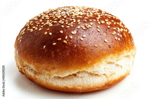 A golden-brown sesame seed burger bun, capturing its rich texture and lightly toasted crust, isolated against a white background. Ideal for themes related to food, baking, and gourmet cuisine.