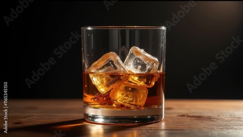 A golden-brown whiskey cocktail glistens on the rocks, invitingly full and frosty cold, with two ice cubes nestled in the center of the glass