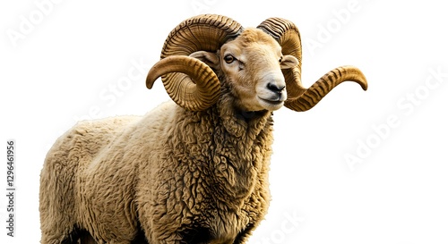 A golden-horned ram standing proudly, representing the Qurbani tradition, with a clean white backdrop
