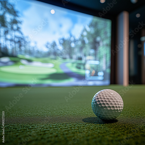 A golf ball is sitting on a green grassy field. The ball is white and has a small black dot on it. The field is surrounded by a green wall, and there is a golf simulator in the background