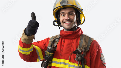 A good looking firefighter dressed in a traditional orange firefighter uniform suit showing two thumbs up