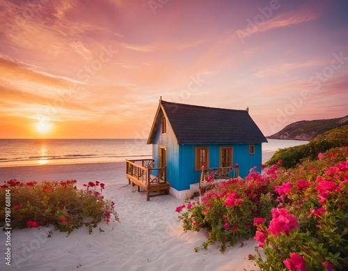 A gorgeous beach with a small home, beautiful flowers. sunset over the beach.