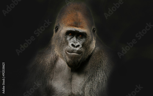 A gorilla with a serious expression on a dark background
