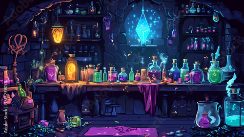 A gothic-style apothecary selling mysterious potions and enchanted products under dim candlelight. Enchanted - Castle. Illustration