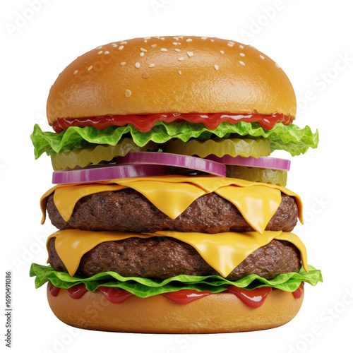 A gourmet cheeseburger, meticulously stacked with golden brioche bun, seared beef patty, molten cheddar, lettuce, onion, pickles, ketchup, isolated on a transparent, culinary advertising concept