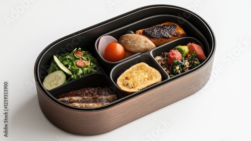 A gourmet chef’s lunchbox, high-end presentation, organic ingredients, luxury aesthetic, elegant illustration, isolated on white background.