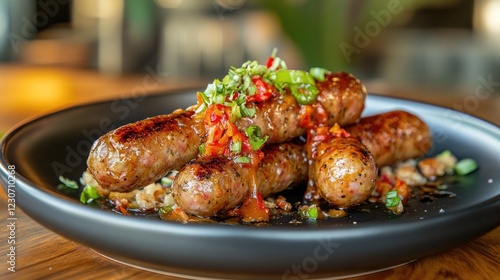 A gourmet dish with fried sausages drizzled with a tangy glaze.