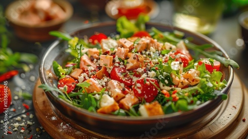 A gourmet salad in a bowl, topped with fresh greens and sliced tomatoes.