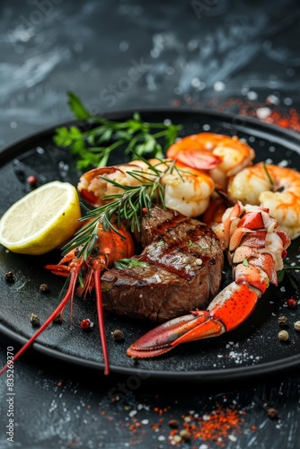 A gourmet surf and turf dish with steak and lobster, displayed on a dark plate with ample copy space around