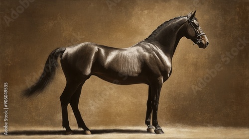 A graceful horse in profile on a solid brown background, showcasing its strength and elegance.