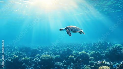 A graceful sea turtle glides through sun drenched turquoise waters a peaceful journey through the coral reef ecosystem