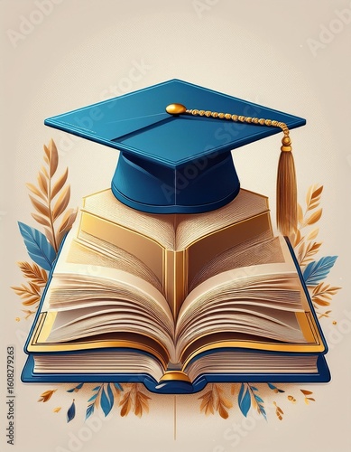 A graduation cap rests atop an open book, symbolizing knowledge, education, and academic achievement in a creative and vibrant design.