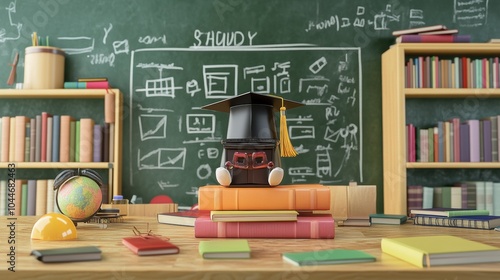 A graduation cap sits atop colorful books in a vibrant classroom filled with learning materials and a chalkboard covered in notes. Generative AI