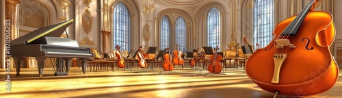 A grand concert hall featuring a piano and string instruments, ready for a performance.