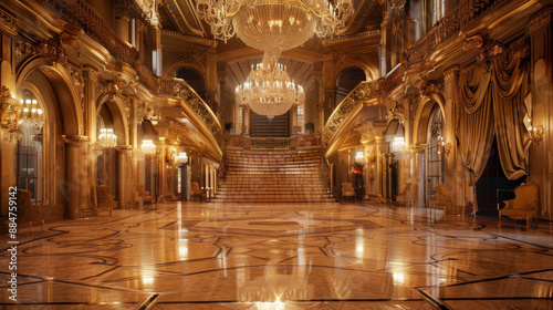 A grand, opulent ballroom with chandeliers, polished floors, and ornate decorations. Include elements like draped curtains, large mirrors, and a grand staircase to enhance the luxurious ambiance.