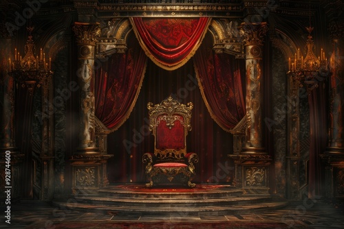 A Grand Throne Room with Ornate Decor and Red Curtains