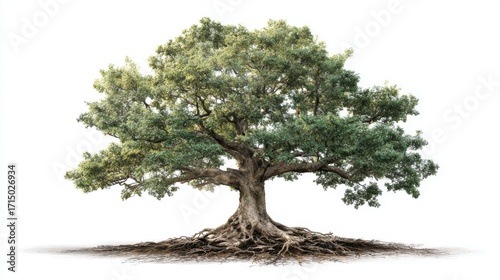 A grand tree stands prominently with a wide canopy of green leaves. The intricate root system reveals strength and stability set against a clean background emphasizing natures beauty.