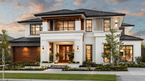A grand, two-story house with a modern design, featuring a crisp white facade, dark gray shingles, and large, elegant windows, sits serenely in a landscaped yard under a soft evening sky.