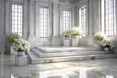 A grand, white marble hall with floral arrangements on a tiered platform.
