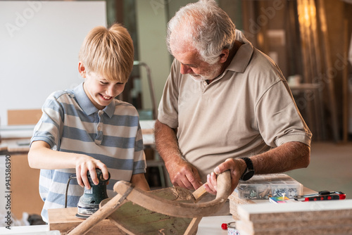 A grandfather teaches his grandson how to fix furniture in his carpenter workshop.