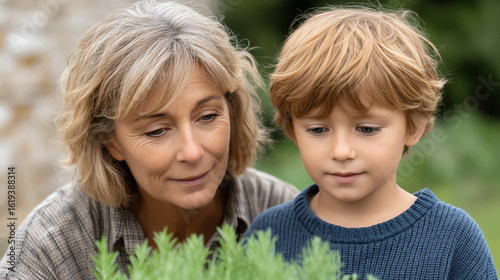 A grandmother and her grandson share a bonding moment while nurturing plants in a garden, fostering a love for nature and family.