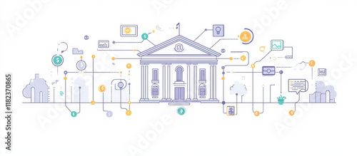 A graphic depicts a financial institution with various digital elements surrounding it. Symbols of data exchange, finance, and technology represent modern banking.