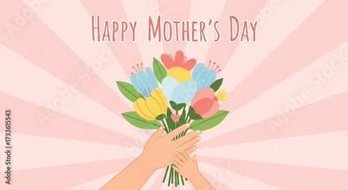 A graphic illustration for Mother's Day. It shows a pair of hands holding a bouquet of colorful flowers with the text "HAPPY MOTHER'S DAY" at the top.