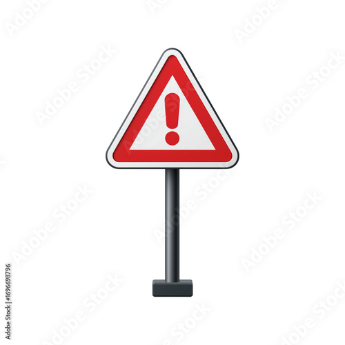 A graphic representation of a triangular, red-and-white hazard sign, mounted on a metal pole
