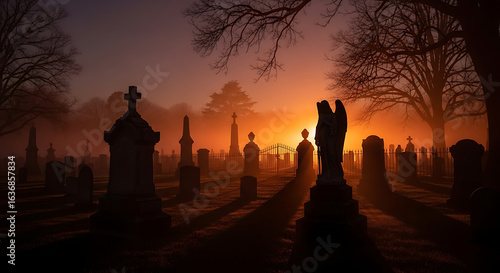 A graveyard with tombstones and an angel statue silhouetted against a foggy sunset sky at dusk ai generated
