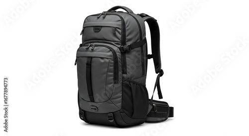 A gray and black hiking backpack with multiple compartments isolated on a white background studio shot