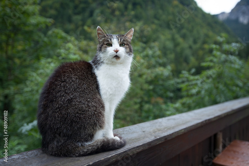 A gray and white cat perched on a wooden rail, observing its surroundings with curious eyes.