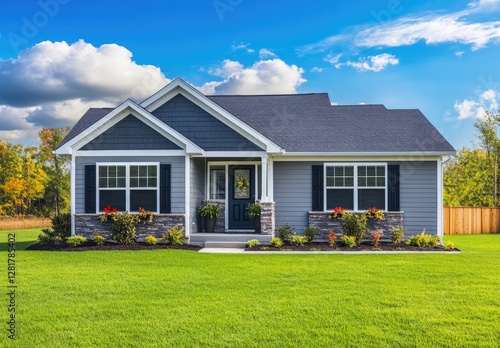 A gray Craftsman-style house with white trim, green grass in the front yard, and potted plants on the porch.