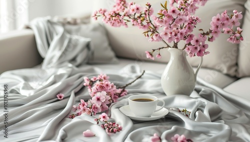 A gray smooth satin blanket with pink flowers wrapped around it lies on the...