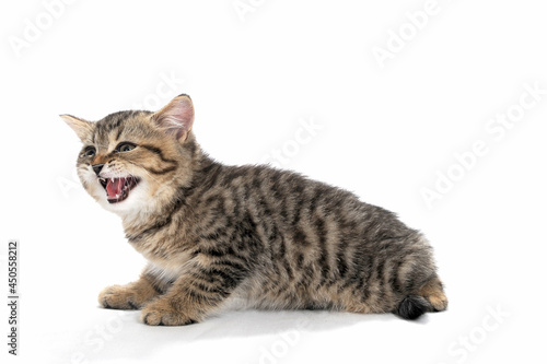 a gray striped purebred kitten sits on a white background