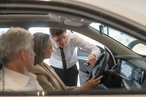 A gray-haired Caucasian woman is sitting behind the wheel of a car. Car dealership salesman consulting mature married couple.