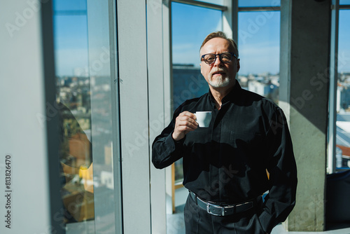 A gray-haired man in a black shirt and coffee in his hands stand by the window in the office.