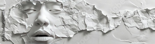 A grayscale image of a woman's face emerging from a cracked stone wall.