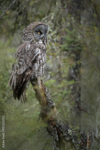 A great gray owl perched deep in a boreal forest surrounded by greenery.