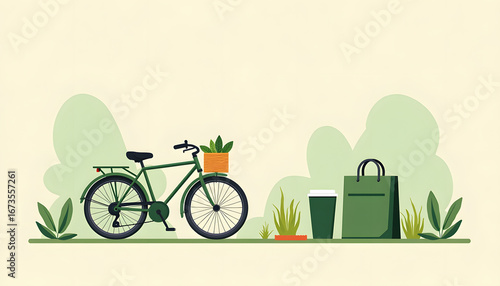 A green bicycle with plants, coffee and shopping bag, for eco-friendly living.