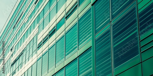 a green building?s solar panels, capturing the architecture?s focus on sustainability and renewable energy
