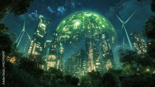 a green city surrounded by wind turbines and trees, landscape of a future city